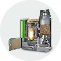 Calderes de pèl·lets de 4 a 256 kW , amb múltiples possibles configuracions d’emmagatzematge i regulació. Pantalla tàctil de sèrie amb control remot mitjançant Smartphone, Tablet o PC. També disponibles en gamma de condensació fins a un 15% d’eficiència extra